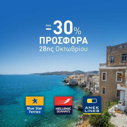 30% έκπτωση σε όλες τις θέσεις επιβατών στις γραμμές Δωδεκανήσων, Β. Αιγαίου, Ηρακλείου και Χανίων.