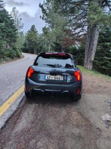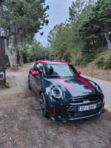 Από πλευράς χώρων, πρέπει να θυμόμαστε ότι το JCW παραμένει ένα τρίθυρο (απίστευτο εν έτη 2025) σπορ hatchback με σαφή προσανατολισμό στον οδηγό. Μπροστά θα βολευτείς εύκολα με σωστό εύρος ρυθμίσεων σε καθίσματα/τιμόνι. Πίσω, οι ενήλικες θα βρουν περιορισμένο χώρο για γόνατα και κεφάλι στις μεγάλες αποστάσεις. Παραδοσιακά MINI… Το πορτμπαγκάζ των 210 lt είναι μικρό για οικογενειακές ανάγκες, αλλά επαρκεί για δύο σακίδια και τα καθημερινά. Αυτή είναι η φύση του αμαξώματος και δεν προσπαθεί να σε πείσει για κάτι διαφορετικό.
