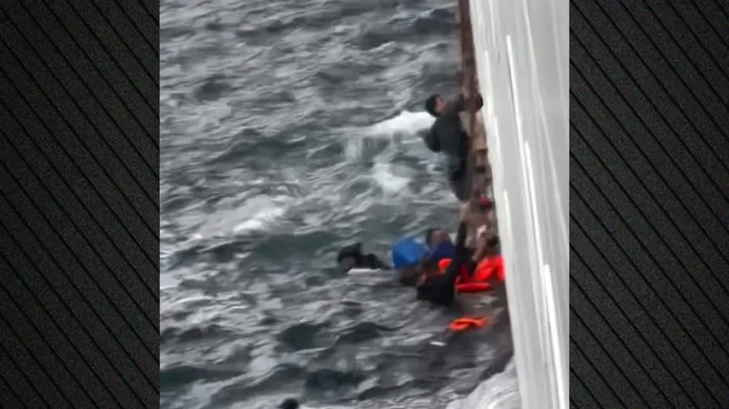 Το δραματικό βίντεο δείχνει τους μετανάστες να παλεύουν με τα κύματα καθώς προσπαθούν επανειλημμένα να ανέβουν τη σκάλα του πλοίου, πέφτοντας ξανά και ξανά στη θάλασσα.