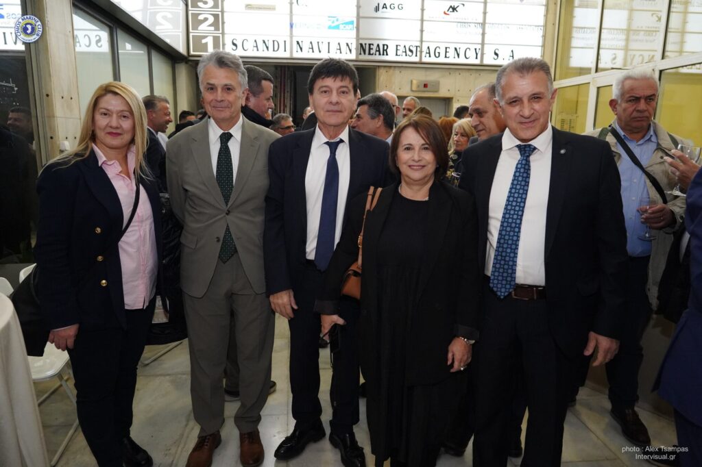 Από αριστερά προς δεξιά: Capt. Ελένη Παπαδοπούλου (Γενική Γραμματέας Π.Ε.Π.Ε.Ν.), Αντιναύαρχος Π.Ν. ε.α. Αθανάσιος Μακρής (Διευθυντής γραφείου Υφυπουργού Ναυτιλίας & Νησιωτικής Πολιτικής), ο Αντιπεριφερειάρχης Πολιτικής Προστασίας Αττικής & Υποναύαρχος ε.α. Λ.Σ. Λεωνίδας Μανωλάκος, η Διοικήτρια του Ναυτικού Απομαχικού Ταμείου (Ν.Α.Τ.) Γεωργία Μανιάτη, ο Πρόεδρος του Chios Marine Club Capt. Αντώνης Πιτσιλός