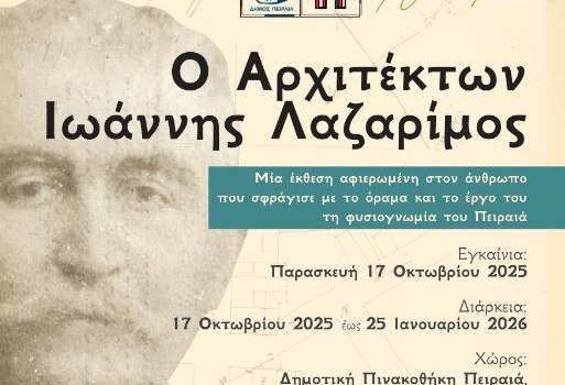 Η επιτυχημένη έκθεση «Ο Αρχιτέκτων Ιωάννης Λαζαρίμος» συνεχίζεται στη Δημοτική Πινακοθήκη Πειραιά, προσκαλώντας το κοινό να γνωρίσει τη ζωή και το έργο του σπουδαίου Πειραιώτη αρχιτέκτονα.