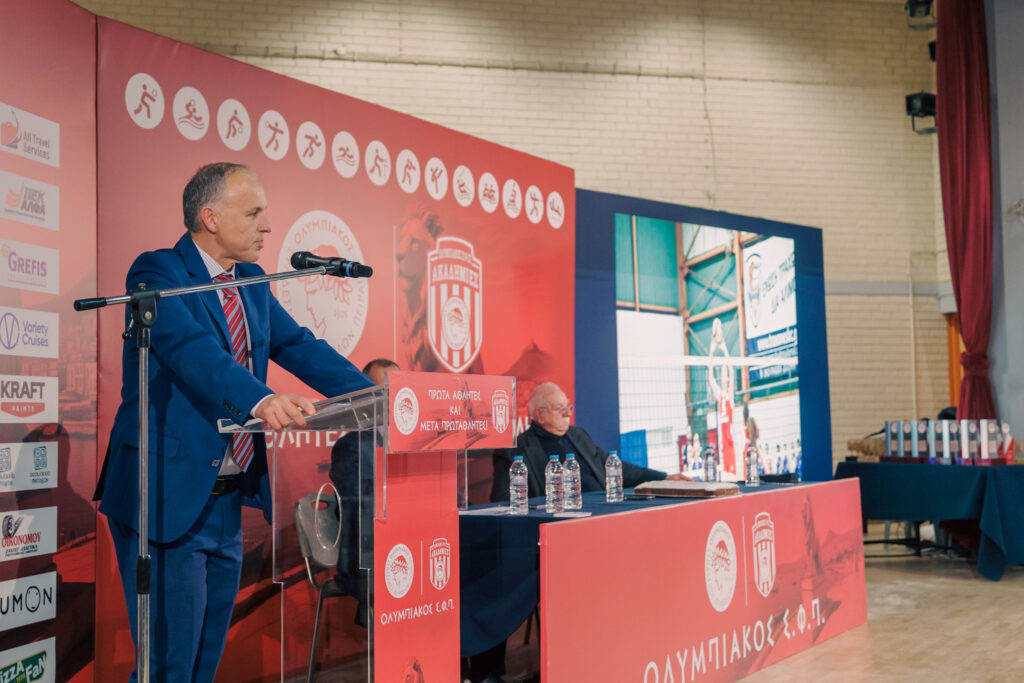 «Τα τελευταία δεκαπέντε χρόνια καταβάλλουμε μια τιτάνια προσπάθεια, υπό την Προεδρία του Μιχάλη Κουντούρη και των μελών του Διοικητικού Συμβουλίου, ώστε ο Ολυμπιακός να βρίσκεται στην κορυφή, όχι μόνο της Ελλάδας και της Ευρώπης, αλλά ολόκληρου του κόσμου. Αρωγοί σε αυτή την προσπάθεια είναι τα χιλιάδες μέλη μας, με την οικονομική συνεισφορά της ΠΑΕ και της ΚΑΕ, καθώς και την αμέριστη συμπαράσταση και ενίσχυση του Προέδρου της ΠΑΕ Ολυμπιακός Ευάγγελου Μαρινάκη. Αγαπητοί γονείς, να γνωρίζετε ότι έχετε εμπιστευτεί τα παιδιά σας όχι μόνο σε άρτια καταρτισμένους προπονητές, αλλά κυρίως σε καλούς ανθρώπους, που τα «αγκαλιάζουν», στέκονται δίπλα τους και τα βοηθούν να ξεπερνούν κάθε εμπόδιο, ώστε να πετυχαίνουν τους στόχους τους. Άλλωστε, βασική αρχή του σωματείου μας είναι πρώτα να διαμορφώνουμε αθλητές και μετά πρωταθλητές».