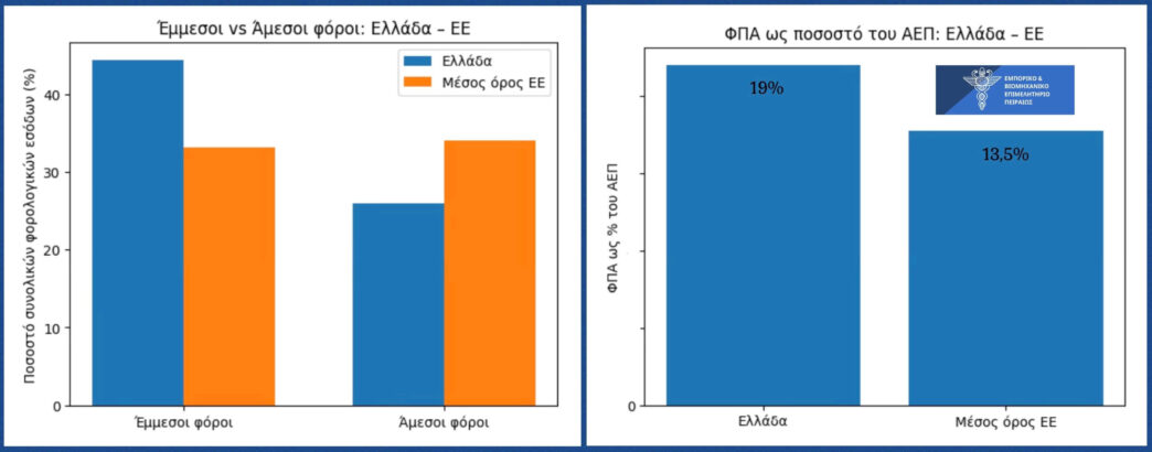 Το Εμπορικό και Βιομηχανικό Επιμελητήριο Πειραιώς επισημαίνει πως η σύγκριση των φόρων στην ΕΕ-27 δείχνει ότι το φορολογικό ζήτημα δεν είναι απλώς το ποσοστό, αλλά η ισορροπία μεταξύ άμεσης και έμμεσης φορολόγησης. Στην Ελλάδα, οι άμεσοι φόροι αντιστοιχούν σε χαμηλότερο ποσοστό του ΑΕΠ, ενώ οι έμμεσοι φόροι σε σαφώς υψηλότερο ποσοστό, σε σχέση με πολλές ευρωπαϊκές οικονομίες, δημιουργώντας ένα φορολογικό μείγμα έντονα προσανατολισμένο στην κατανάλωση. Ωστόσο, οι έμμεσοι φόροι αποτέλεσαν και συνεχίζουν να αποτελούν ένα αποτελεσματικό φοροεισπρακτικό εργαλείο για δημοσιονομική σταθερότητα στην Ελλάδα. Όμως, η υπερβολική εξάρτηση από αυτούς ενέχει κοινωνικούς και αναπτυξιακούς κινδύνους. Το ζητούμενο για τα επόμενα χρόνια δεν είναι η κατάργησή τους, αλλά η σταδιακή εξισορρόπηση του φορολογικού μείγματος, ώστε να διατηρηθεί η δημοσιονομική αξιοπιστία χωρίς να υπονομεύεται η αγοραστική δύναμη, η κοινωνική συνοχή και η ανταγωνιστικότητα της οικονομίας.