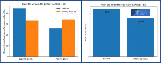 Σύμφωνα με τα τελευταία ευρωπαϊκά στοιχεία που διαθέτει το Ε.Β.Ε.Π., οι έμμεσοι φόροι στην Ελλάδα αντιστοιχούν από 17,3% έως 19%, ως ποσοστό του ετήσιου ΑΕΠ, έναντι μέσου όρου 13,5% στην Ευρώπη, κατατάσσοντας την χώρα μας στην 4η υψηλότερη θέση στην ΕΕ, δημιουργώντας αρνητικές επιπτώσεις στην ανταγωνιστικότητα των επιχειρήσεων, τον πληθωρισμό και το διαθέσιμο εισόδημα των πολιτών. Παράλληλα, περίπου το 44% των συνολικών φορολογικών εσόδων προέρχεται από την κατανάλωση, όταν ο μέσος όρος της ΕΕ κινείται κοντά στο 33%. Η διαφορά αυτή δεν είναι ούτε περιστασιακή, ούτε μια απλή λεπτομέρεια, είναι μία δομική επιλογή. Το κρίσιμο ερώτημα δεν είναι αν η Ελλάδα έχει υψηλή φορολογία συνολικά, αλλά πού και πώς επιλέγει να φορολογεί και ποιες είναι οι κοινωνικές και οικονομικές συνέπειες να γίνουν οι έμμεσοι φόροι ο βασικός πυλώνας.